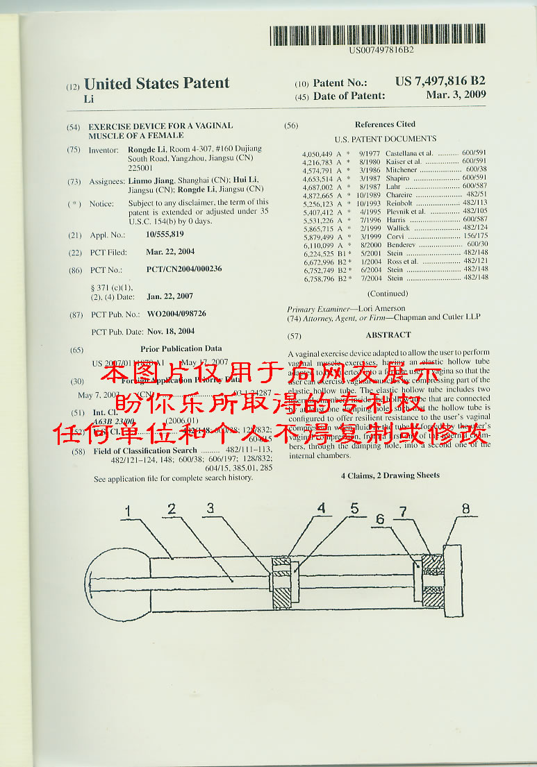 盼你乐“女性缩阴器”产品被美国专利局授予发明专利权。